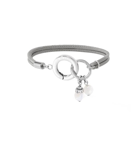 Mother-of-pearl, rhinestone rondelles, stainless steel, leather. Round lobster stainless steel.
