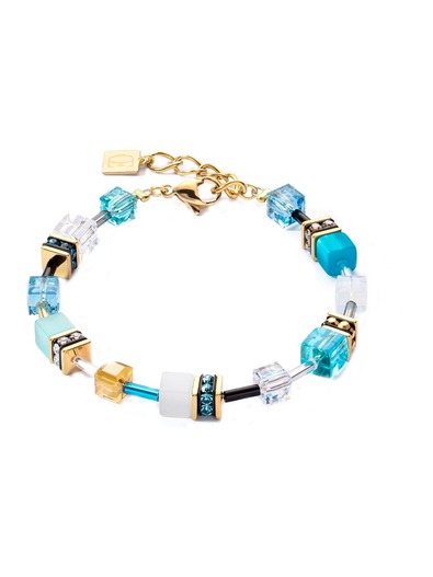 Synthetic tiger’s eye, SwarovskiA® Crystals, rhinestone rondelles. Polaris, stainless steel gold. Clasp stainless steel gold plated.
