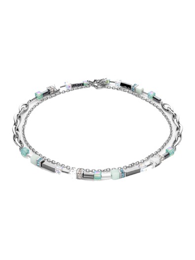 Amazonite, howlite, haematite, SwarovskiA® Crystals, rhinestone rondelles, stainless steel. Clasp stainless steel.