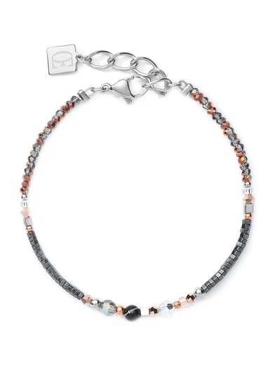 haematite, haematite with titanium oxide finishing, cut glass, swarovskiA® crystals, stainless steel, glass-rocailles, stainless steel rose gold. clasp stainless steel. striped onyx.