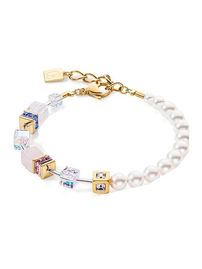 Rose quartz, rock crystal, Crystal Pearls by SwarovskiA®, SwarovskiA® Crystals, rhinestone rondelles, crystal glass, stainless steel gold. Clasp stainless steel gold plated.