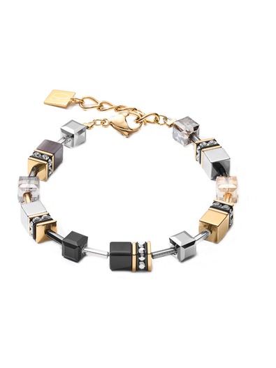 synthetic tiger’s eye, swarovskiA® crystals, haematite with titanium oxide finishing, rhinestone rondelles, glass, stainless steel gold. clasp stainless steel gold plated.