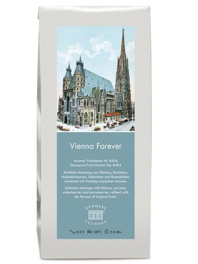 Teabag with elegant label with nostalgic Vienna motif. Filled with 100g flavoured Fruit Infusion “Berry Cocktail”, a delicious blend of hibiscus, currants, elderberries, raisins and rose blossom refined with tropical, fruity flavourings.