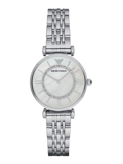 Tailored and sophisticated, this Emporio Armani timepiece showcases a stainless steel seven-link bracelet, matching stainless steel case and a feminine, mother-of-pearl dial.