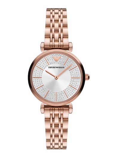 Emporio Armani’s 32mm watch features a sunray silver dial, two-hand movement and rose gold-tone stainless steel bracelet.