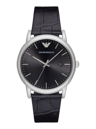 This contemporary Emporio Armani stainless-steel watch features a minimalist black sunray dial, date window and croco-embossed black leather band.