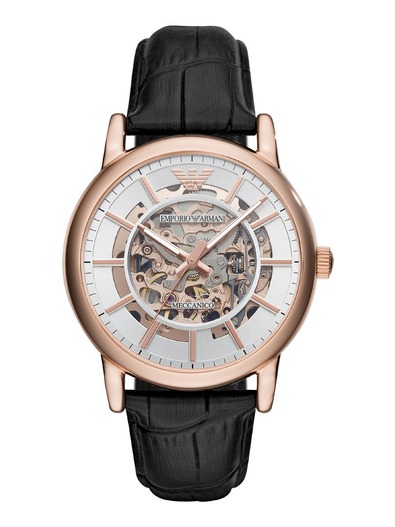 This stylish men’s watch from Emporio Armani features a polished rose gold-tone case, silver sunray skeleton dial with a pop of rose gold-tone IP plating on the inner movement and black leather strap.