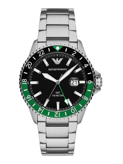 Emporio Armani’s 42mm watch features a black enamel dial, GMT dual time movement and stainless steel bracelet.