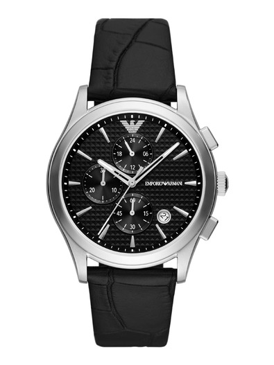 Emporio Armani’s 42mm watch features a black sunray textured dial, chronograph movement, at least 50% recycled stainless steel case and black leather strap.