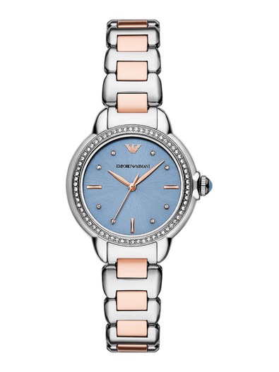 Emporio Armani’s 32mm watch features a blue sunray dial, three-hand movement and two-tone stainless steel bracelet.