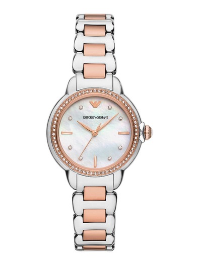 Emporio Armani’s 32mm watch features a mother of pearl white glossy dial, three-hand movement and two-tone stainless steel bracelet.