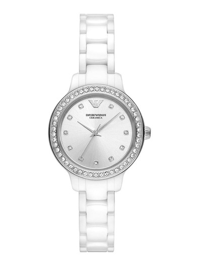 Emporio Armani’s 32mm watch features a white silver sunray dial, three-hand movement and white ceramic bracelet.