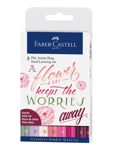 Pigmented India ink; High lightfastness; Waterproof, permanent; Odourless, acid-free, pH neutral; Does not bleed through paper; Wallet of 8; Content: S = 0.3 mm colour 133 magenta, B = brush tip colours 114 pale pink, 125 middle purple pink, 129 pink madder lake, 131 coral, 133 magenta, 172 earth green, 239 lilac; Ideal for creative letterings and letter art; Available individually and in various assorted sets