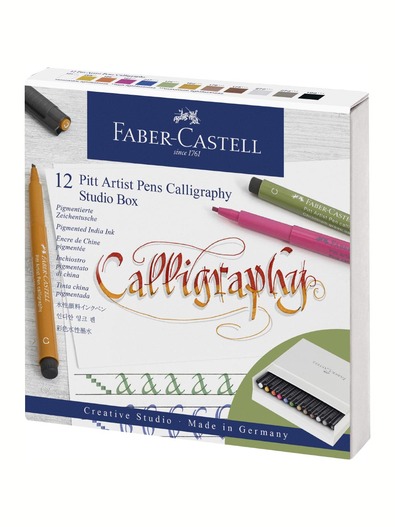 Ideal set for the art of beautiful writing; Studiobox with 12 Pitt Artist Pen Calligraphy, assorted colours; Pigmented India ink; High lightfastness; Waterproof, permanent; Does not bleed through paper;Odourless, acid-free, pH neutral; Calligraphy nib; Developed with professional calligraphy artists; Ideal for creative lettering and calligraphic work