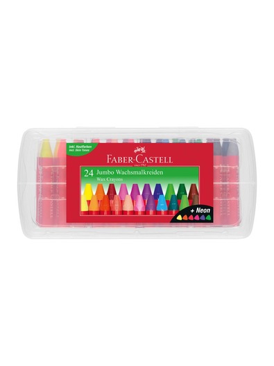 Preschool and school; Jumbo wax crayons; Ergonomic triangular shape for effortless colouring; Vibrant colours and smooth stroke; With paper sleeve; Water-resistant; Practical, re-usable platic box of 24;