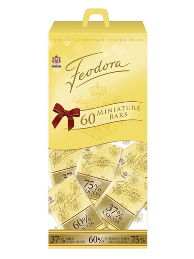 This stylish transparent pack is filled with 60 superior miniature chocolate bars with three different cocoa intensities: Premium Milk Chocolate with 37% cocoa as well as Superior Dark with 60% and 75% cocoa. The finest chocolate miniature bars from Feodora in a high-quality, resealable pack are an ideal gift.