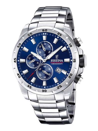 Festina Gents Chronograph. Solid 45mm Stainless steel case and strap. Blue dial with silver applied index and hands. Chronometer, 24h & date functions. 10 BAR water resistant.