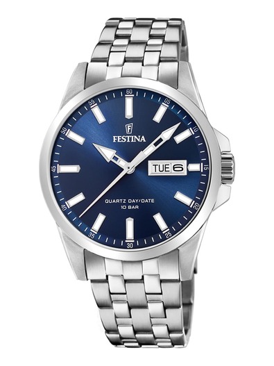 Festina Sporty watch with a 41mm stainless steel case and bracelet with security clasp. Blue dial with applied indices & luminous hands as well as day & date functions. 10 BAR water resistant. 2 year international guarantee.