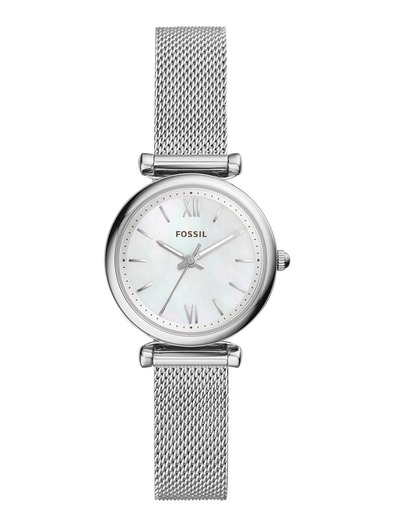 This 28mm Carlie features a mother-of-pearl dial with Roman numerals, three-hand movement and steel mesh bracelet.