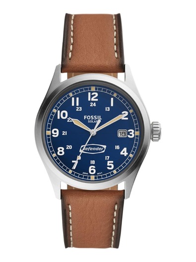 This 40mm Defender features a blue matte dial, solar-powered movement and luggage eco leather strap.