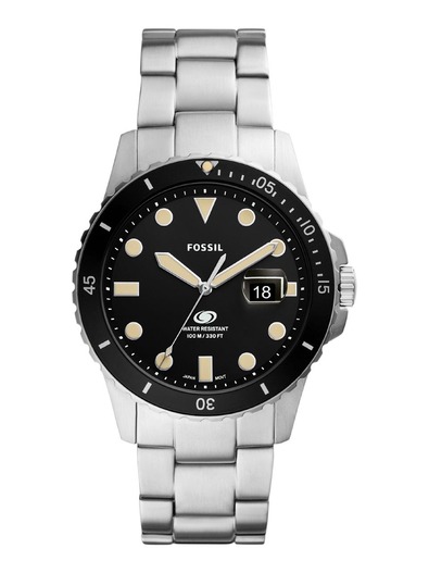 This 42mm Fossil Blue watch features a black sunray dial, three-hand date movement and stainless steel bracelet.