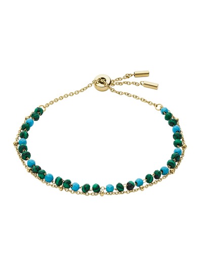 This beaded bracelet features green malachite and turquoise beads, gold-tone stainless steel and a slider closure.