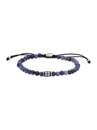 This bracelet features sodalite beads, black nylon cord, stainless steel and a slider closure.