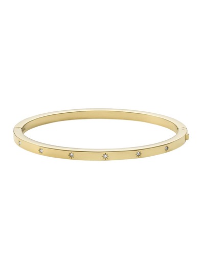This cuff bracelet features gold-tone stainless steel and a push button closure.