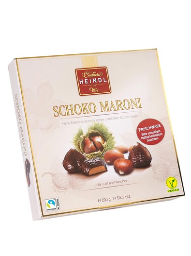 The classic in the Heindl range: Our sweet chocolate chestnuts. Fine chestnut mousse covered in delicate dark chocolate – that’s the vegan secret of our traditional chocolate chestnuts.Only available in the autumn and winter seasons!ATTENTION fresh produce!As only high-quality ingredients are used for our chocolate chestnuts and we avoid preservatives, this article has a maximum lifespan of 28 days after production