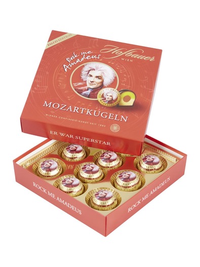 Hofbauer creates a special memorial to Falco (1957-1998) for his world hit “Rock me Amadeus”. A special premium Mozartkugel with a heart made of the finest nougat, covered in fine marzipan and dark chocolate, is dedicated to the Austrian musician. Inspired by W.A. Mozart, Falco managed to storm the top of the US charts for the first time with a German-language song in the 1980s.