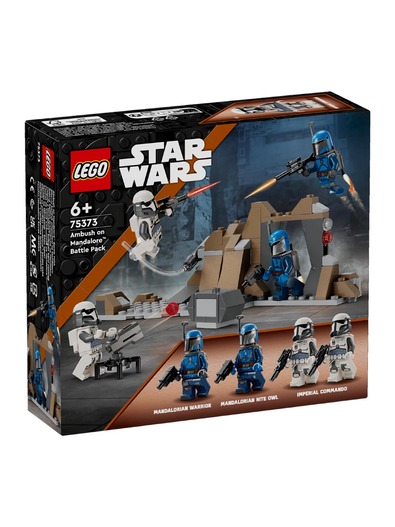 Fly into jetpack battles on Mandalore! Patrol the cave with the Mandalorian Nite Owl and Mandalorian Warrior. But beware! The Imperial Commandos are ready to launch an ambush attack with their jetpacks, blaster pistols and stud-shooting cannon. Use the Mandalorian warriorsA blasters and jetpacks to fight back. Who will triumph? ItAs up to you!