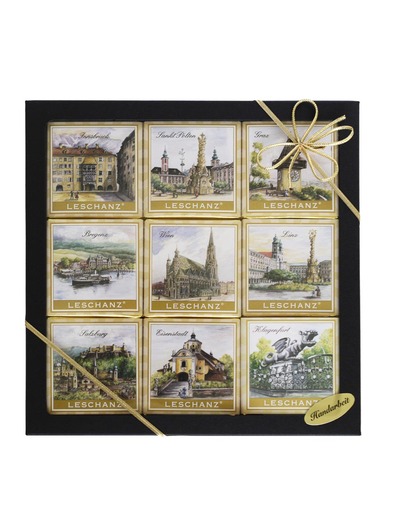 Finest Organic milk chocolate tablets with 9 famous Austrian attractions.