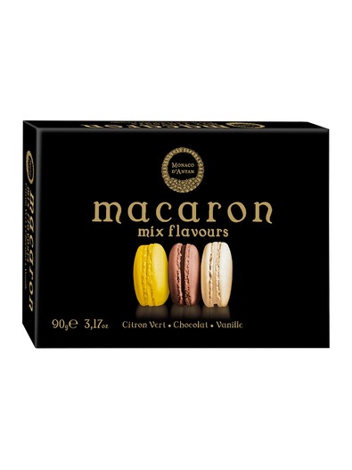 MACARON VANILLE – Meringue ingredients: almonds 30%, icing sugar (sucrose, corn starch), sugar, egg white (ground chicken egg), pres ervative: potassium sorbate, natural aroma of vanilla beans. Cream ingredients: white chocolate (sugar, cacao butter, whole milk powder, emulsifier: soy lecithin, natural vanilla flavor), milk cream, sugar, whey milk concentrate, alcol, milk protein. MACARON CHOCOLAT -Meringue ingredients: almonds 30%, icing sugar (sucrose, corn starch), sugar, egg whites (ground chicken egg), cocoa powder, preservative: potassium sorbate, vanillin. Cream ingredients: white chocolate (sugar, cacao butter, whole milk powder, emulsifier: soy lecithin, natural vanilla flavor), milk cream, sugar, whey milk concentrate, alcol, cocoa powder 4%, milk protein. MACARON CITRON VERT – Meringue ingredients: almonds 30%, icing sugar (sucrose, corn starch), sugar, egg white (ground chicken egg). Food grade dye: glucose syrup, water, glycerol. Colouring: Safflower. Thickener: E401. Acidity regulator: E330 (citric acid). Preservative: E202. Emulsifier: E433. Alcohol. Preservative: potassium sorbate. Cream ingredients: white chocolate (sugar, cocoa butter, whole milk powder, emulsifier: soy lecithin, natural vanilla flavor), milk cream, sugar, concentrated whey of milk, alcohol, milk proteins, rind grated lime, natural lemon flavor 3%.