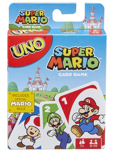 Join Mario, Luigi, and all their friends for a special game of UNOA¢! It’s the classic UNOA¢ you love, but this version also includes a special Mario Super Star Card that makes your character invincible! After another player plays a Draw 2+ or Wild Draw 4+ card, you play the Super Star Card to bounce the power back to that player and make THEM draw two or four cards! Score points by being the first to get rid of all the cards in your hand. First player or team to 500 wins. When you’re down to one card, don’t forget to yell “UNO!” Contains 112 cards plus simple instructions. For 2 to 10 players, ages 7 and older. Colors and decorations may vary.